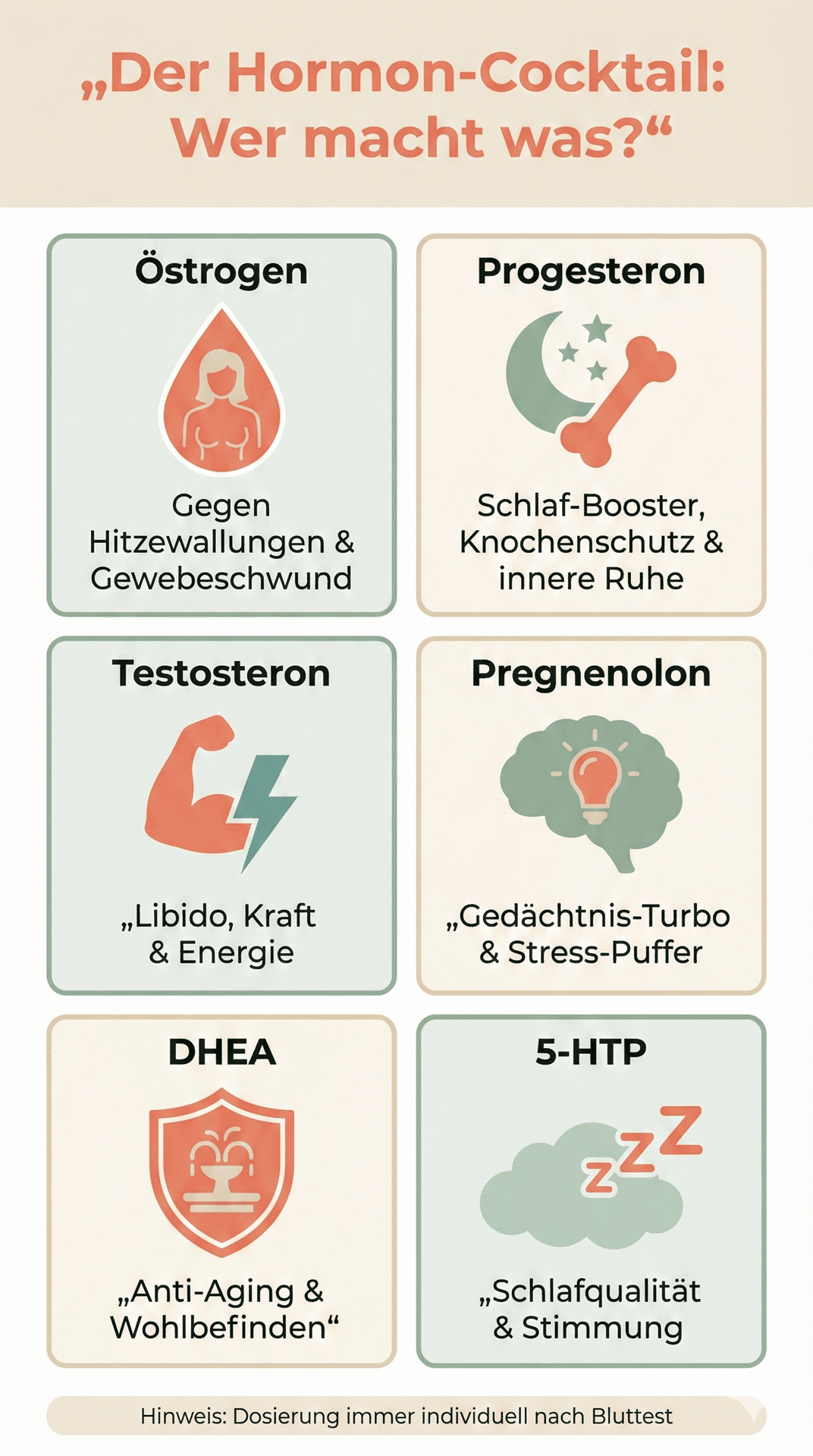 Auch Testosteron ist für Frauen essenziell. Ein Mangel führt oft zu Libidoverlust, Kraftlosigkeit und Gelenkschmerzen. Zur Unterstützung der kognitiven Leistung und der Stressresistenz wird häufig Pregnenolon eingesetzt. Als Vorläuferhormon ist es Ausgangsstoff für diverse andere Botenstoffe und gilt als effektiv, um das Gedächtnis zu stärken. Ergänzend kann DHEA (Dehydroepiandrosteron) genutzt werden, um das allgemeine Wohlbefinden und die Stresstoleranz zu erhöhen. Für besseren Schlaf sorgt oft die Aminosäure 5-HTP, eine Vorstufe von Serotonin und Melatonin.